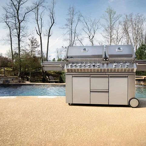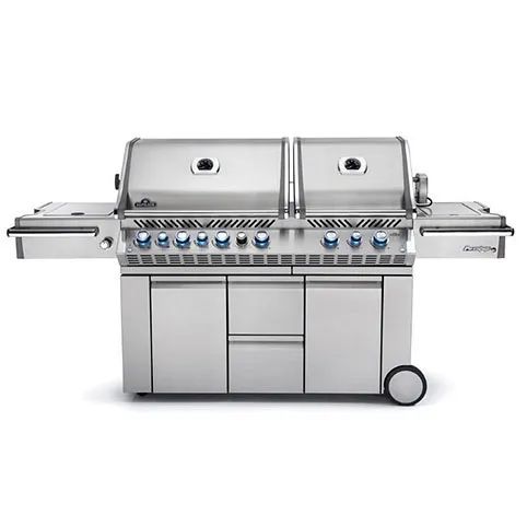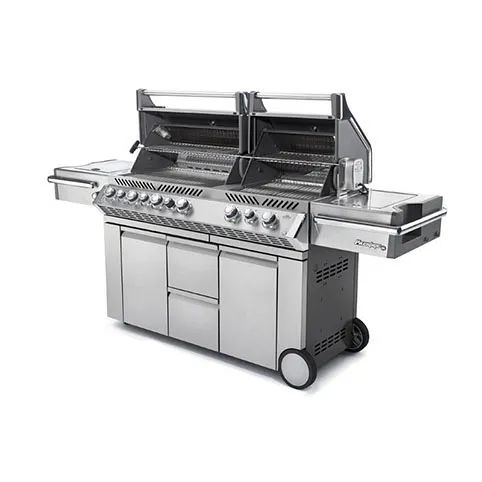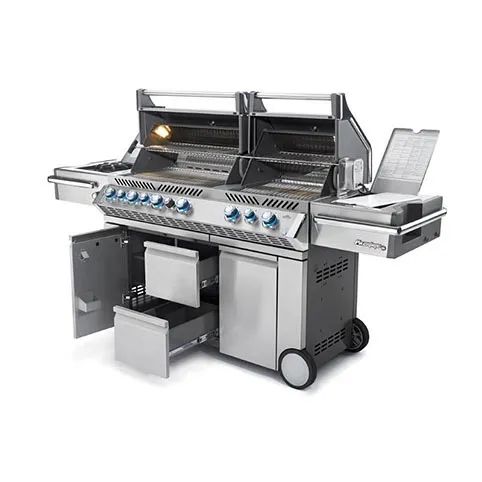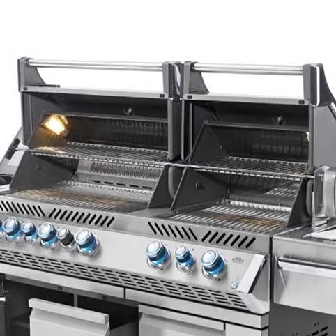 Во второй части расположены две инфракрасные горелки для обжарки стейков SIZZLE ZONE и дополнительная горелка. В левом пристолье дополнительная горелка. Основная решетка из высококачественной 9,5 мм стали и дополнительная решетка для подогрева. Электронный поджиг газа, встроенное освещение жарочной поверхности, подсветка ручек iGlow и встроенные в крышки термометры. Просторные отсеки для газового баллона и хранения принадлежностей. Сделано в Канаде.