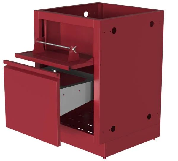 - выдвижной системой с доводчиком для мусорного ведра, которое закрывается крышкой на фиксаторах,